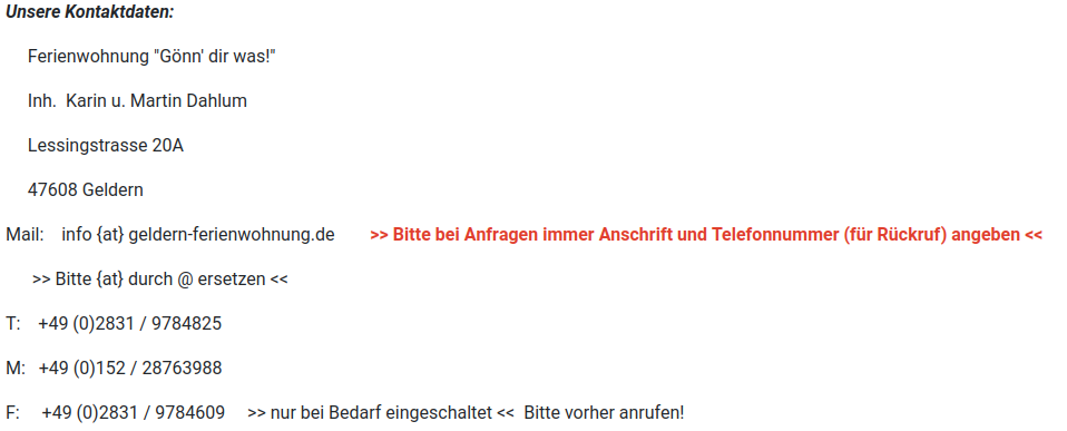 Der Mietvertrag über die anliegend beschriebene Ferienwohnung ist verbindlich geschlossen, wenn eine Rückbestätigung vom Mieter unterschrieben dem Vermieter zugegangen ist.